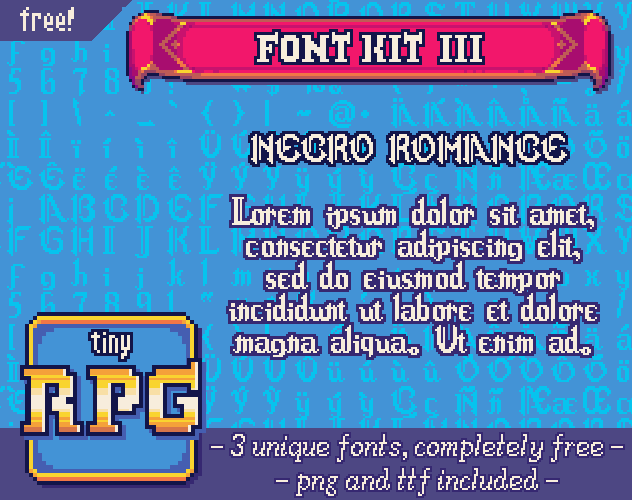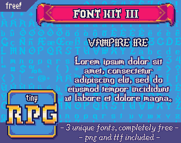 Is your RPG in desperate need for that edgy pixelated font from the good ole days of vampire hunting? Look no further! This completely FREE pack will cover all your needs:
